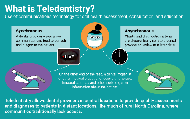 North Carolina’s Dental Practice Act, which regulates the practice of dentistry in the state, was written long before teledentistry was a viable opportunity for care. Additionally, a dentist who currently provides “synchronous” teledental care (i.e. live dental consultation, education, or examination provided in real-time) would be limited in their compensation. Equally as important, there currently is no reimbursement model for asynchronous teledentistry (i.e. “store-and-forward” care in which x-rays and other diagnostic information is taken and later reviewed by a dentist off-site).