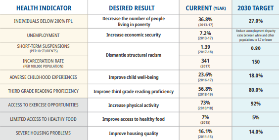 This excerpt from “Healthy North Carolina 2030” highlights non-medical factors like incarceration rate, reading proficiency, and suspensions as important indicators of health.