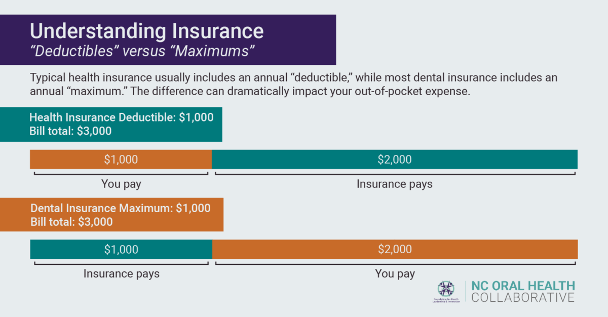 Dental insurance generally works in the opposite manner. Most dental plans have “annual maximums,” not deductibles. With a maximum of $1,000, once you reach $1,000 in expenses that the insurance company has paid, you as the individual are responsible for 100 percent of your oral health care costs for the remainder of the contract year.