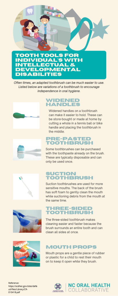 For more information on dental providers in your region, contact your Regional Dental Hygienst, which can provide information on dentists that accept individuals with intellectual and developmental disabilities, pregnant women, young children, and other patients with specific needs.