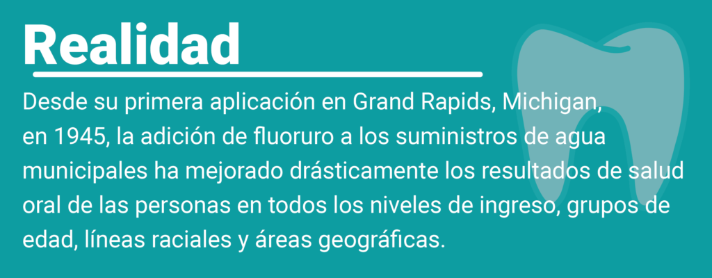 Desde su primera aplicación en Grand Rapids, Michigan, en 1945, la adición de fluoruro a los suministros de agua municipales ha mejorado drásticamente los resultados de salud oral de las personas en todos los niveles de ingreso, grupos de edad, líneas raciales y áreas geográficas.